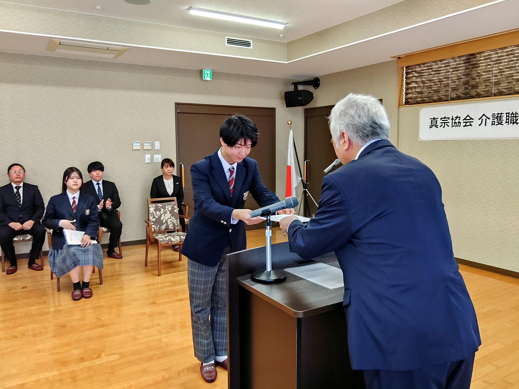 奨学生証を受けた青木晴海さんは「一生懸命勉強して高齢者の皆様に喜ばれる介護福祉士になりたいです」と語り、早川光生さんは「勉強することがたくさんあると思いますが、頑張って介護の勉強をして介護福祉士を取得したい」と力強い言葉をいただきました。